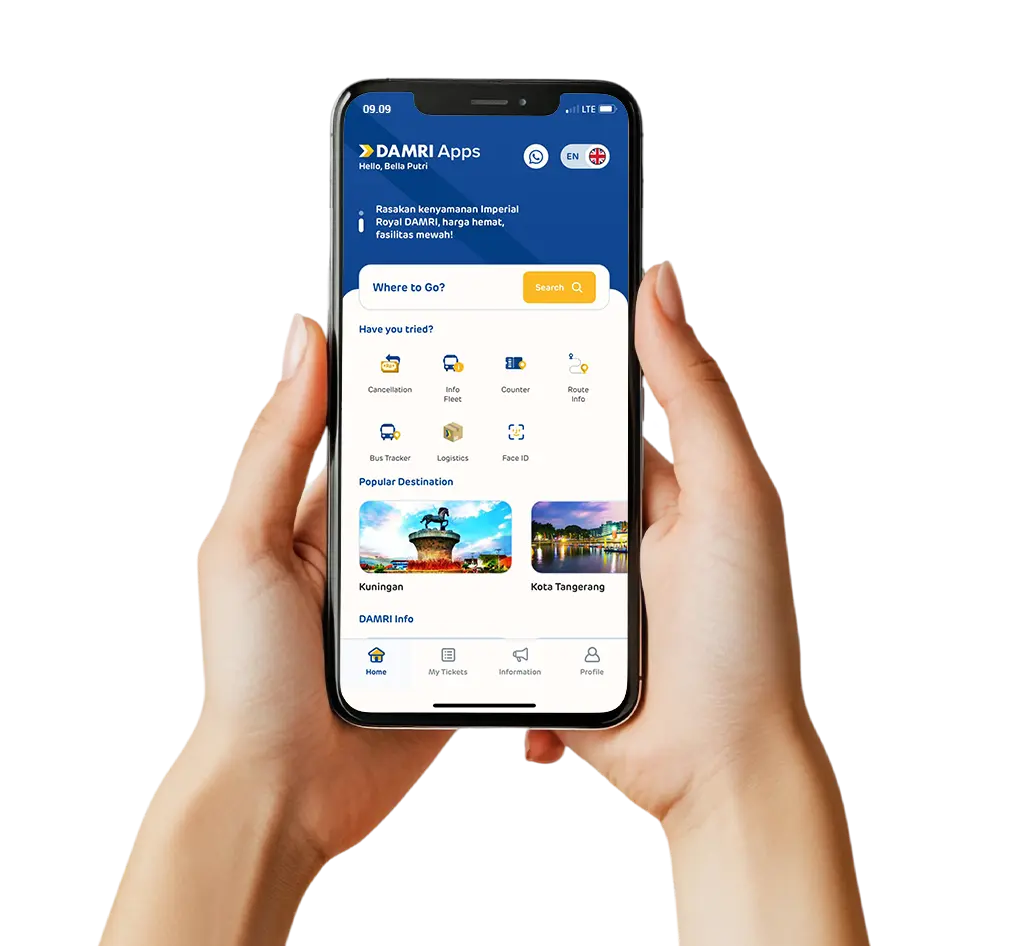 Nyaman, aman, dan terjangkau ke lebih dari 100+ rute pilihan di seluruh Indonesia. Pesan tiket kapan saja, di mana saja, langsung dari DAMRI Apps.